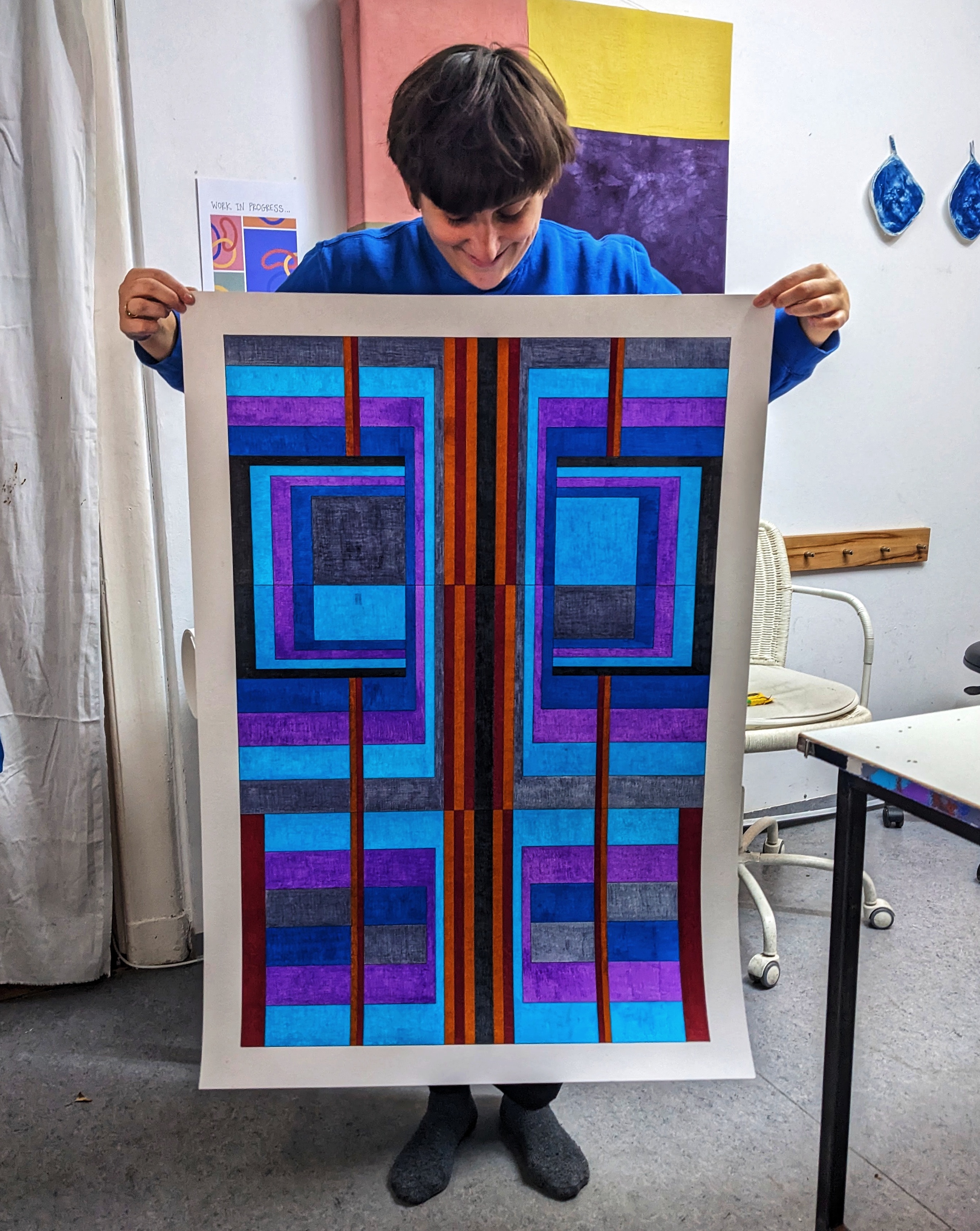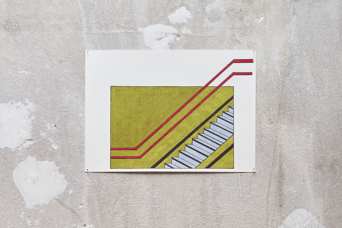 Staircase (2023)acryl on paper on MDF, nails, yarn